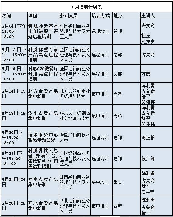 科脉与您一路同行,共同成长,为了更贴近您的服务需求,切实为合作伙伴们解决后顾之忧,现将我司6月份的培训计划表进行公告,具体事项如下: